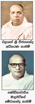 1957 වර්ෂයේ දී විජයනන්ද නා හිමියන් අපවත් වීමෙන් අනතුරුව විජය සෞගත විද්‍යාලයේ ආධිපත්‍යයට පත් වූ මාදුපිටියේ ශ්‍රී මේධානන්ද නායක ස්වාමීන්ද්‍රයන් වහන්සේ ලක්දිව ගිහි පැවිදි කා අතරත් ප්‍රකටව වැඩ සිටි චිර ප්‍රසිද්ධ ධර්ම දේශකයාණන් වහන්සේ නමකි. දුගී පැලේ සිට රජ මැදුර දක්වා බණ කියූ උන්වහන්සේ හැට, හැත්තෑව දසකවල වඩාත් ප්‍රසිද්ධ ගුවන්විදුලි ධර්ම දේශකයාණන් වහන්සේ වූහ. ව්‍යක්ත, විශාරද හා බහුශ්‍රැත පඬිවරයකු වූ උන්වහන්සේ සිංහල, පාලි, සංස්කෘත හා ඉංගී‍්‍රසි භාෂාවන් පිළිබඳ මෙන් ම ත්‍රිපිටක ධර්මය පිළිබඳ ද හසල දැනුමකින් හෙබි යතිවරයකු වූහ. දේශනයෙන් මෙන්ම ලේඛනයෙන් ද දක්ෂතා දැක්වූ උන්වහන්සේ විවිධ දහම් පොත පත හා ශාස්ත්‍රීය ලිපි ලේඛන ලියා පළකරමින් පුළුල් ධර්ම ශාස්ත්‍රීය මෙහෙවරක නිරත වූහ.